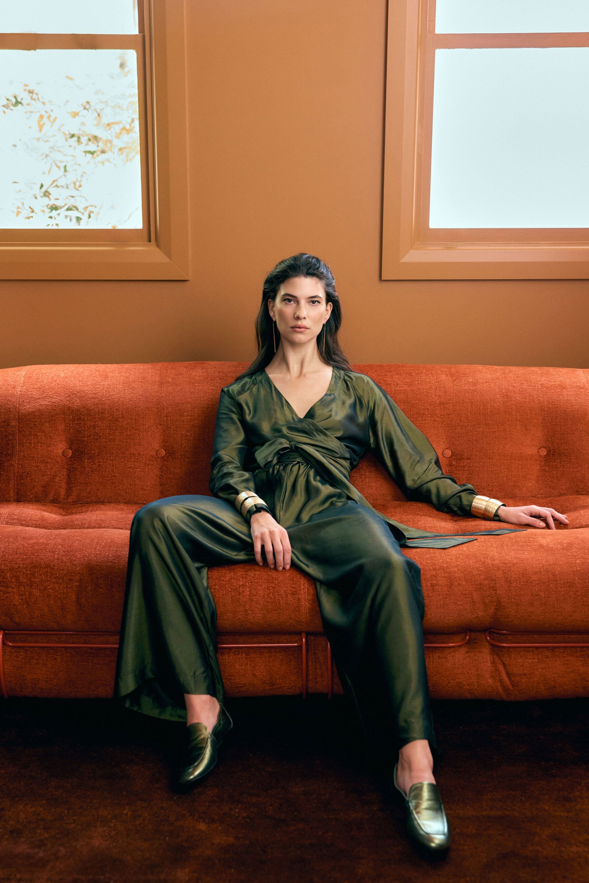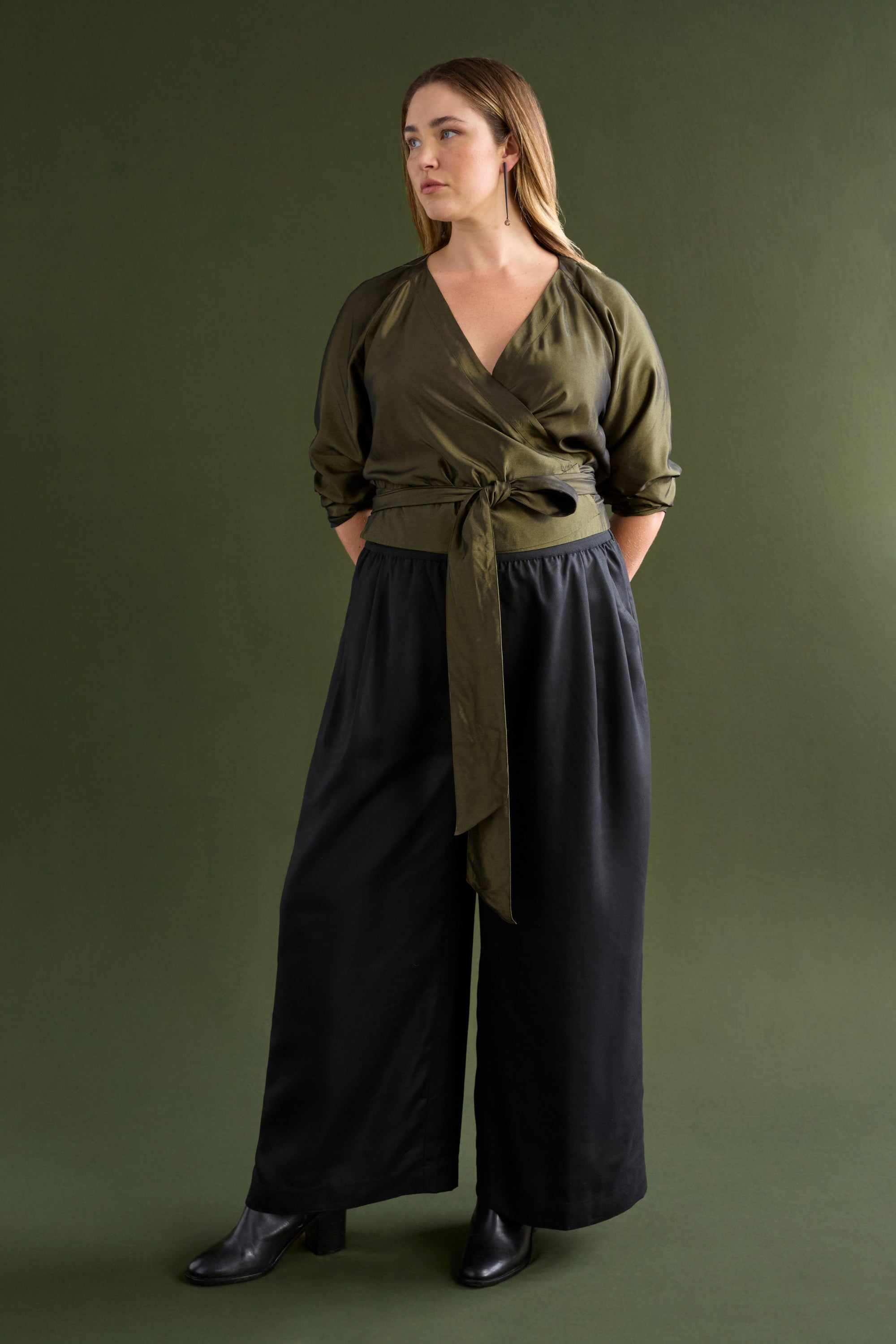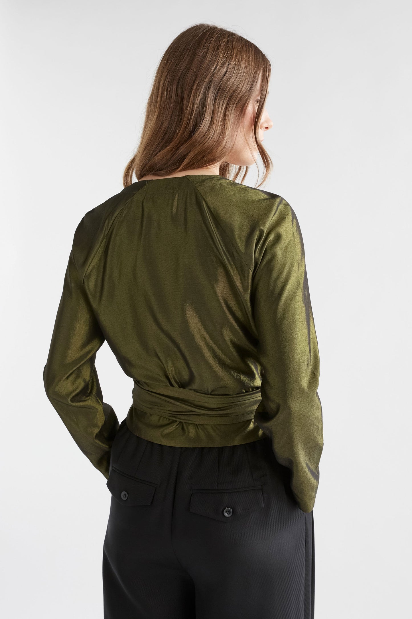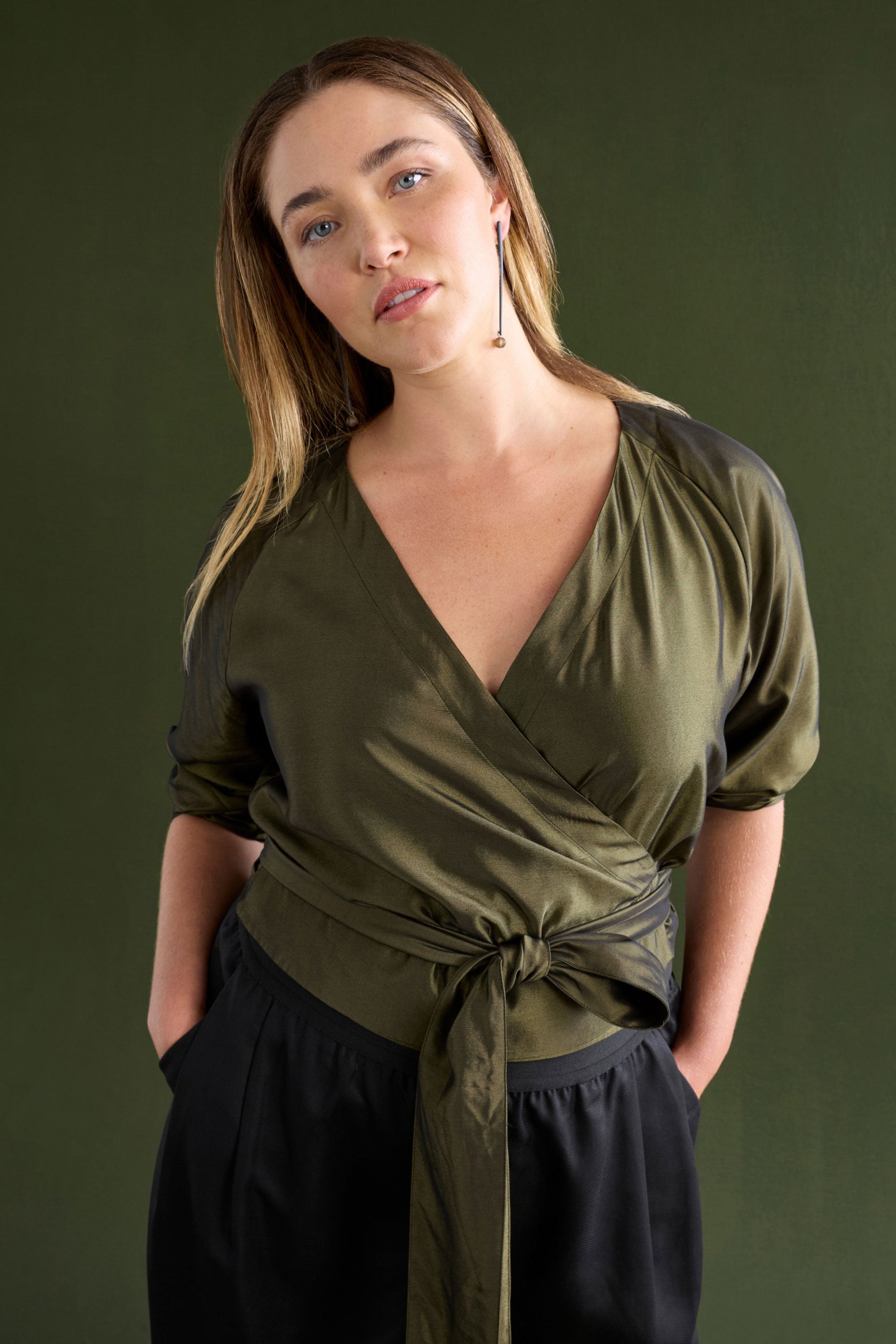 The Medjal Top is a wrap-style top cut from metallic fabric, woven with black and gold yarns for a rich, light-catching finish. The cropped silhouette wraps at the waist with self-fabric ties, while soft gathers at the bodice create fluid shape. Raglan sleeves offer a relaxed feel, balanced by a sophisticated V-neckline. Take it from desk to dance floor by pairing with the Unika Pant for a polished day look, or create a bold jumpsuit effect by matching with the Medjal Pant for evening glamour.