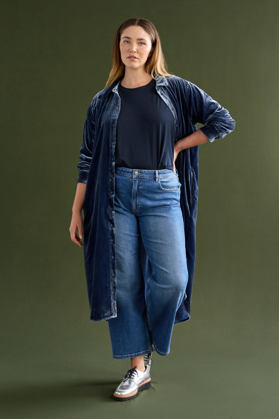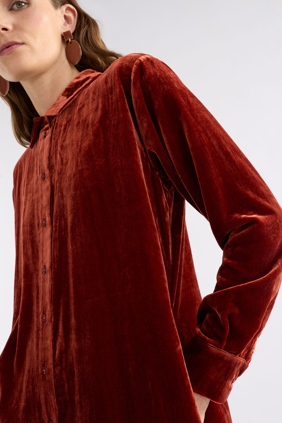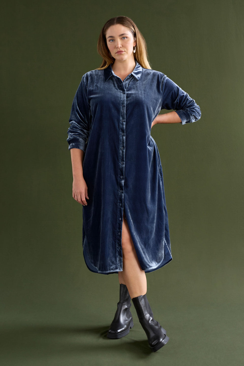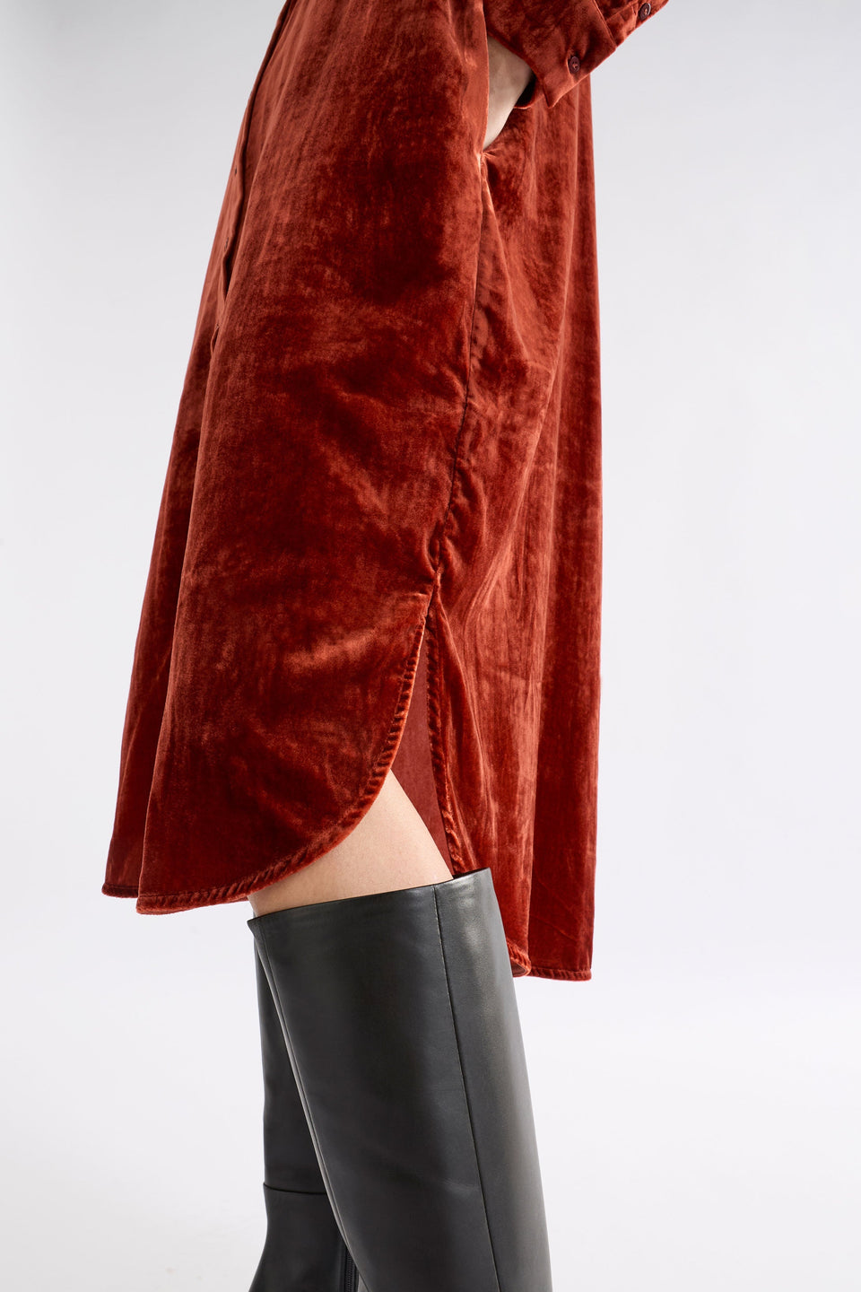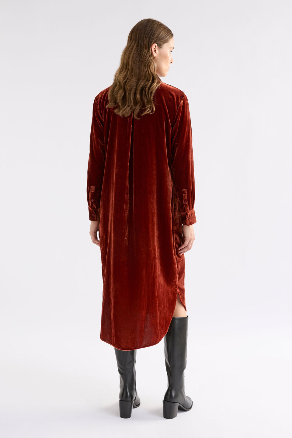 As autumn settles in, this tactile velvet shirt dress brings warmth and texture to your wardrobe. With a midi-length cut, button-through front, and long sleeves with button cuffs, it combines comfort and style. The back inverted tuck offers fluidity, while the curved high-low hem and side seam pockets keep it practical and versatile.