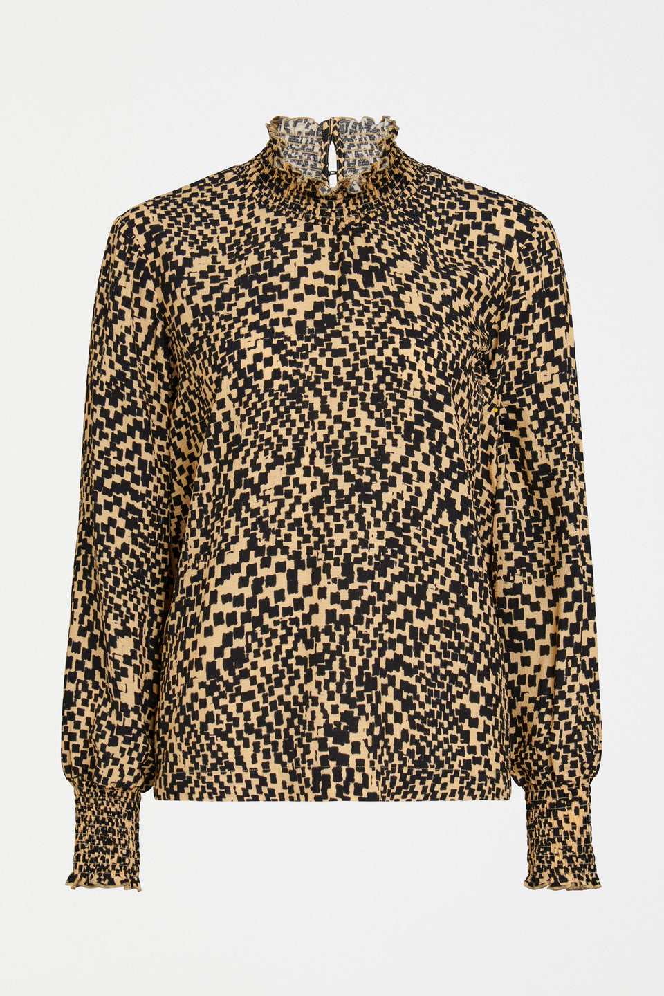 Veda Shirred Neck and Cuff Long Sleeve Top Front | BEIGE SINDA PRINT