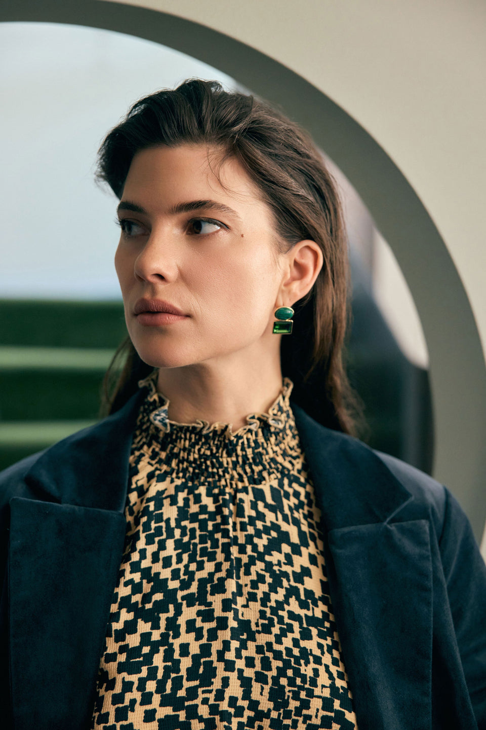 Crafted from a waffle crepe viscose, the Veda Turtleneck Top features our Beige Sinda Print, thoughtfully designed to colour-match seamlessly both with separates across the collection and your wardrobe staples. Shirred gathers at the neck and cuffs add interest, making this piece the perfect base layer for styling under knitwear and blazers. Wear untucked over the Unika Pant, finishing with loafers for a smart, streamlined work look.